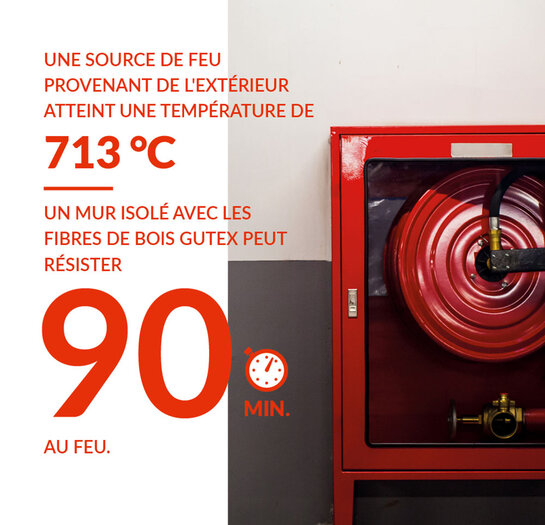 Certains combustibles fossiles s'égouttent brûlant de la façade et produisent une fumée très toxique. En cas d'incendie, nos panneaux isolants en fibres de bois se carbonisent à la surface. Cela freine le passage du feu et donne plus de temps pour sauver les habitants. En outre, il est prouvé que les panneaux isolants en fibres de bois contribuent à la résistance au feu des éléments de construction, car ils retardent fortement le passage de la température. Et comme ils ne se consument que lentement, l'élément de construction bénéficie d'une résistance volumétrique plus longue que celle de certains autres matériaux isolants.