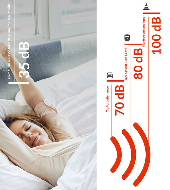 Utilisés de manière conséquente, nos systèmes et produits peuvent atténuer le bruit dans votre maison d'environ 50 dB. C'est énorme, car nous percevons déjà une différence de 10 dB comme étant deux fois moins bruyante.